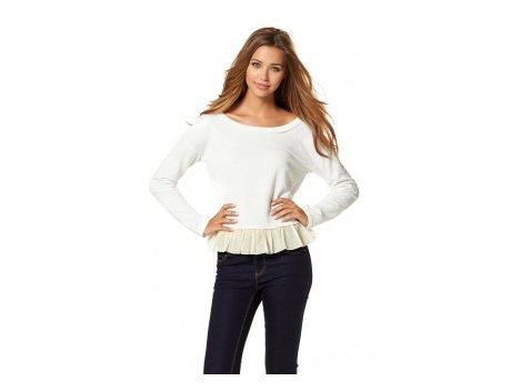 Atstovas ant linijos. Žavingas moteriškas megztinis su nėrinių ir šifono apdaila ties ištisiniu Kišenė, kuri dirba su nekilnojamojo perlų mygtukai. Ilgas rankos...