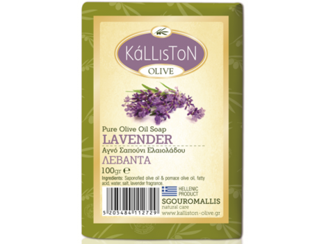 Levandų kvapo ALYVUOGIŲ ALIEJAUS muilas Kalliston Lavender, 100 g Natūralus alyvuogių muilas. Pagamintas iš alyvuogių, nuskintų ir prinokintų Graikijos alyvmedžių giraitėse. Alyvmedžio muilas maitina, drėkina, atgaivina odą, ilgai naudojant suteikia odai antioksidacinių savybių, neužkemša porų, suteikia odai elastingumo, švelnumo. Tinka visų tipų odai, yra natūrali prausimosi priemonė vaikams, alergiškiems žmonėms, kuriems alyvuogių muilas - tikra gamtos dovana. Alyvuogių aliejus yra natūralių antioksidantų šaltinis. Muilą puikiai tinka naudoti kaip skalbimo priemonę - tai natūrali ir hipoalerginė priemonė net mažųjų rūbeliams. Alyvuogių aliejaus muilas su levandų aromatu ramina ir atpalaiduoja, nuteikia svajingai ir ilgesingai.
