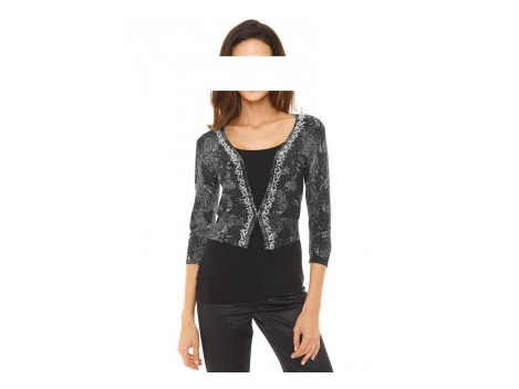 Gryno moteriškumo išraiška. Stilingas Pagrindinis su smulkiu šriftu ir bauda apipjaustymas sidabro pilka-balta blizgučiai ir putojantis brangakmenių. Patraukli stiliaus madinga trumpa forma su smulkių blizgučių ir Ornamento palei juostele. Mažas kablys ir akies uždarymas. ¾ ilgio rankovėmis. Briaunuoti rankogaliai ir Hem. Liemeniu forma. Ilgis apie 46 cm. Priglausti Minkštas, aukštos kokybės Puikus trikotažas pagamintas iš 65% poliesterio / 20% viskozė / 15% vilna.