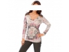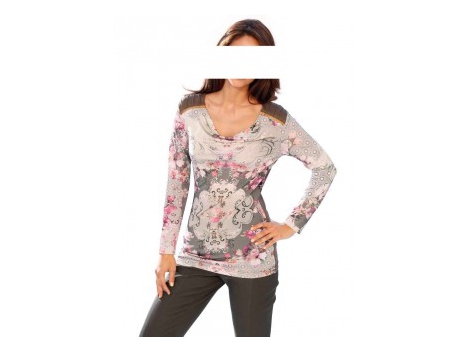 Charmante Kreation ganz im Zeichen der modernen Weiblichkeit. Kreativ in Szene gesetztes Shirt mit starkem Print, weichem Wasserfallausschnitt, geraffter Schulterpartie mit aktuellem Zipper - ein Mode-Highlight der Extraklasse! Zipper kupferfarben. Rückteil unifarben Taupe. Länge ca. 64 cm. Figurbetonte Form. Herrlich softe Qualität aus 93% Viskose/7% Elasthan.