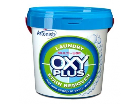 "ASTONISH" dėmių valiklis su aktyviuoju deguonimi, 1 kg Angliška kokybė. Tik vienas kaušelis kiekvienam plovimui! OXY-PLUS yra stipraus poveikio valiklis deguonies pagrindu, veiksmingai šalinantis sunkiai valomas dėmes ir nemalonius kvapus. Gali būti naudojama buityje - tiek patalpose, tiek lauke. VALYMUI: tinka kasdieniams skalbiniams, vaikų drabužiams, staltiesėms, tinklinėms užuolaidoms, sportiniams drabužiams, vonios ir virtuvės rankšluosčiams. UŽMERKIMUI: labai nešvariems skalbiniams, šiukšlių dėžėms, miegmaišiams ir palapinėms, tinkmedžio ir stiklo pluošto valtims, kavavirėms, sulčiaspaudėms.DĖMIŲ ŠALINIMUI: nuo baldų apmušalų, nuo apklotų ir užuolaidų, nuo kilimų ir užuolaidų, nuo vaikų žaislų ir lėlių, nuo plytelių ir jų sandūrų, nuo medinių tvorų/paklotų, kitų maisto produktų ir gėrimų dėmėms. OXY-PLUS nekenkia neblunkantiems spalvotiems audiniams arba susilpnėjusiam drabužių pluoštui. Kuo karštesnis vanduo, tuo stipresnis valomasis efektas. Visiškai ištirpdo kristalus. OXY-PLUS sudėtyje esama vandens minkštinimo medžiagos, todėl skalbinius lengva skalbti bet kokiame vandenyje.Prieš naudojimą išbandykite OXY-PLUS tirpalo poveikį nepastebimame plotelyje ir leiskite išdžiūti.