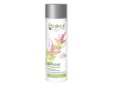 "BAIKAL HERBALS" maitinantis balzamas sausiems ir dažytiems plaukams, 280 mlBaikalo augalų galia! Baikal Herbals maitinantis balzamas sausiems, pažeistiems plaukams švelniai rūpinasi plaukais, saugo nuo lūžinėjimo bei susivėlimo, išlygina juos per visą ilgį, lengvina iššukavimą. Varnalėšų ekstraktas intensyviai maitina, šiurkštusis burnotis saugo galvos odą nuo išsausėjimo. Amūrinis kamštenis suteikia plaukams lygumą, švelnumą, stiprina dažančių pigmentų poveikį.Sudėtyje nėra SLS, parabenų, PEG.