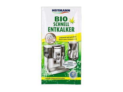 Bio greitasis kalkių nuėmiklis  Heitmann, 2 x 25 g   Greitas kalkių valiklis - Heitmann bio.Su natūraliomis veikliosiomis medžiagomis.Ypač efektyvus dėka natūralių vaisių rūgščių.Nekenksmingas kalkių šalinimas iš kavos, Espresso kavos aparatų, kavos automatų, virdulių, katilų ir t.t.   Reguliarus nukalkinimas saugo Jūsų prietaisus ir garantuoja pilną veikimo pajėgumą.     Naudojimas: pakelio turinį ištirpinti ½ l vandens. Tirpalą supilti į vandens talpą kavos aparate, virdulyje. Prietaisą įjungti ir tirpalą pakaitinti, leisti pvz. praeiti per aparatą.    Po to išskalauti 2 kartus pripylus švaraus vandens.Netinka emalei, marmuriniams paviršiams ir cinkuotiems prietaisams.Paisykite specialių prietaisų gamintojų priežiūros nurodymų.