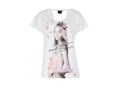 Įspūdingos žaidimas su kontrastų. Permatomas ryškus marškinėliai madinga medžiagų su gėlių spausdinti. Galinis uni juoda apranga, prieš kilnus spausdinta satino...