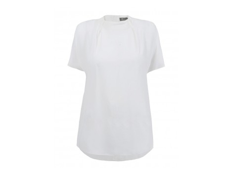 Žavingas moteriškas marškinėliai stiprios spalvos ir su dekoratyviniu mazgas pažvelgti į kairę. Giliai V-iškirpte ir trumpomis rankovėmis. Didžiosios duetas - v...