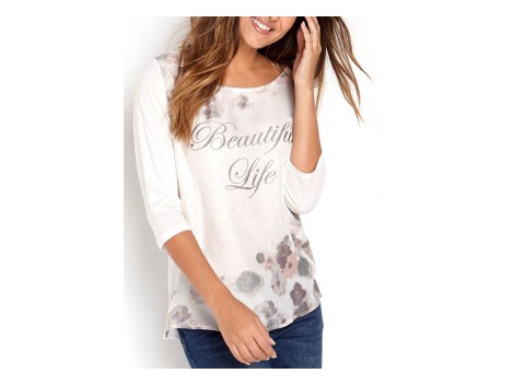 Stylishes Shirt für modische Kombinationen. Cooler Frontprint, edel verziert mit kleinen Glitzersteinchen. Silberfarbene Ziernaht an den Abschlüssen. Ärmelsaum...