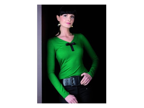 Souveräner Kombistyle ganz designerlike inszeniert. Super feminines Shirt in Wickel-Optik mit üppig drapiertem Schalkragen. Elastische Unterbrustnaht, langer Ar...