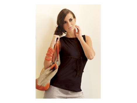 Žavingas moteriškas marškinėliai stiprios spalvos ir su dekoratyviniu mazgas pažvelgti į kairę. Giliai V-iškirpte ir trumpomis rankovėmis. Didžiosios duetas - v...
