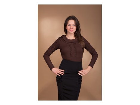 Czekoladowa bluzka z podwójnym kołnierzem. Wzbogacona o dwa, plecione warkocze. Środkowa część z poziomym przeszyciem - pozwala wydobyć zgrabny fason kobiecej sylwetki. Profilowane wcięcie w talii. Długi rękaw. Polski producent. Skład: 95% wiskoza, 5% elastan.  Tabela rozmiarów (w cm)  Długość bluzki Szerokość (obwód biustu) Obwód w pasie (talia) S/38 55 84-88 cm 72-78 M/40 57 86-92 cm 78-82 L/42 59 88-96 cm 80-84 XL/44 61 90-100cm 82-86 XXL/46 63 92-104 84-88