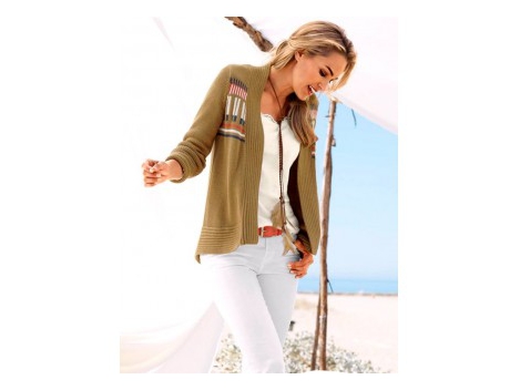 Visi aplink stilingas mados dalis su maksimaliu akį traukiantis veiksnys!. Ekstravagantiškas megztinis su žakardo didelis. Atidaryti, sealless forma, priekiniai šiek tiek trumpesnis nei nugaroje ir lenkta apvadą. Su platus briaunoti skydelyje ir briaunoti rankogaliai. Flare tinka. Ilgis apie 64 cm. Minkštas stambusis megzti 50% medvilnė / 50% akrilo.