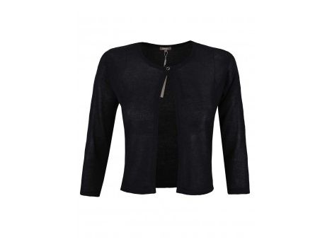Stipri detalė bolero Stricljacke Streaked su smulkiais, sidabriškai žiba juostelėmis. Gaivus ir jaunas pastatyta įvyniojimas išvaizdą ir susieti per kaklaraišti...