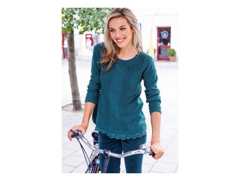 Feminin interpretierter Lässig-Chic für einen top-gestylten, coolen Look. Aufwendiger Zopfstrick ziert den Ausschnitt in Carré-Optik. Allover im Rippenstrick. R...