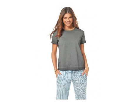 Feminines Basic mit süßen Details. Doppelt gelegte, offene Kanten um den V-Ausschnitt mit hübscher Raffung im vorderen Bereich. Über der Brust ein blumiger Aufd...