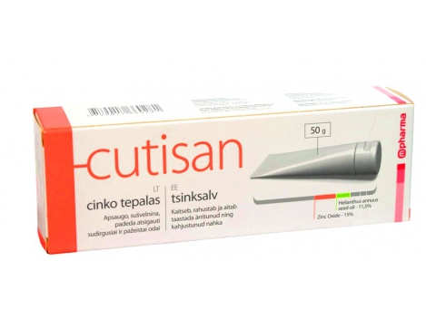 CUTISAN cinko tepalas sudirgusiai, pažeistai odai 50 g „Cutisan“ cinko tepalas formuodamas orui pralaidų apsauginį barjerą neleidžia šlapimui ir išmatoms dirginti kūdikio odelės, taip ją nuramina, minkština ir gerina mažylio odos būklę.Turi švelnų antibakterinį poveikį.Jo sudėtyje esantis cinko oksidas, saulėgrąžų sėklų aliejus ir talkas padeda apsaugoti ir pagerina sudirgusios bei pažeistos odos būklę, mažindami jos šerpetojimą.„Cutisan“ cinko tepalas sudirgusiai ir pažeistai kūdikio odai:• Cinko tepalas apsaugo ir padeda atsistatyti sudirgusiai ir pažeistai odai.• Minkština ir ramina paraudusią, uždegimo paveiktą odą.• Cinko oksidas padeda palengvinti odos sudirgimą, pasižymi sutraukiamosiomis savybėmis bei priešuždegiminiu, antibakteriniu ir priešgrybeliniu poveikiu. Vandeniui atsparus pagrindas suformuoja apsauginį barjerą, neleisdamas dirgikliams (šlapimui ir išmatoms) kontaktuoti su oda.„Cutisan“ taip pat tinka naudoti esant:nedideliems buitiniams nudegimams;saulės nudegimams;įpjovimams, nubrozdinimams;spuogams;pragulų profilaktikai.