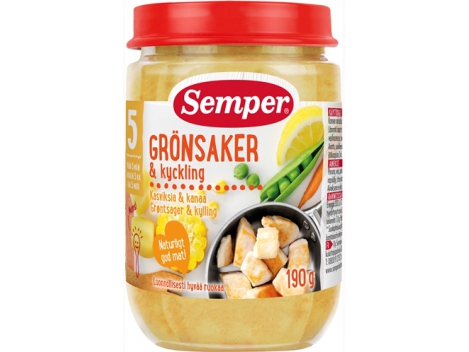 DARŽOVIŲ su VIŠTIENA tyrelė, kūdikiams nuo 5 mėn., Semper, 190 g Kūdikiams nuo 5 mėn. Grynasis kiekis 190g. Be glitimo. Be pridėtos druskos. Svarbu: Dėl papildomo kūdikio maitinimo pasitarkite su gydytoju. Tinka vartoti nuo 5-6 mėn. amžiaus, jei medikas arba kiti už motinos ir kūdikio priežiūrą atsakingi darbuotojai nepatars kitaip. Skirta ne mažesniems nei 4 mėn. kūdikiams.Patiekite kambario temperatūros arba pašildytą. Prieš šildymą atidarykite. Lengvas trakštelėjimas reiškia, kad dangtelis anksčiau nebuvo atidarytas. Šildykite reikiamą kiekį. Pašildytą tyrę išmaišykite ir įsitikinkite, ar ne per karšta. Nelaikykite tyrelės likučių.Sudedamosios dalys: bulvės, vanduo, morkos, vištiena (8%), saldieji kukurūzai, žirneliai, rapsų aliejus, citrinų sultys, baltieji pipirai. Sudėtyje yra 77% daržovių. Sudėtyje nėra glitimo. Gamintojas nededa papildomai valgomosios druskos į maistą, skirtą kūdikiams iki 1 metų.Laikymas: neatidarytą laikykite kambario temperatūroje iki datos, nurodytos ant dangtelio. Atidarytą indelį užsuktu dangteliu šaldytuve galima laikyti 48 valandas.Energinė / maistinė vertė 100g: 302kJ (72 kcal), riebalų 3g, kuriuose sočiųjų riebalų rūgščių 0,4g, angliavandenių 8g, iš kurių cukrų 1g, baltymų 2,5g, druskos 0,04g