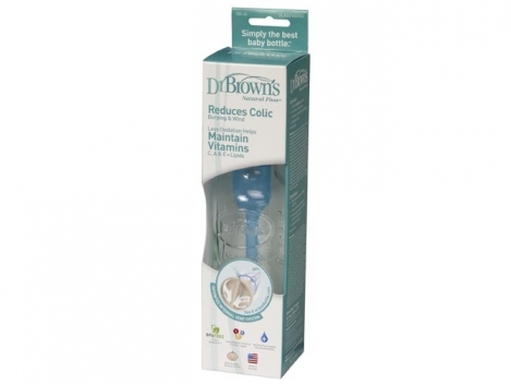 "Dr.Brown's" Natural Flow Standartinis stiklinis kūdikių buteliukas 250 ml.+ I lygio žindukas nuo 0 iki 3 mėn. (261) Dr.Brown‘s Natural Flow stiklinis kūdikių buteliukas, 250 ml. Viduje: stiklinis buteliukas, I lygio žindukas (nuo 0 iki 3 mėn), dviejų dalių vidinė oro cirkuliacijos sistema, valymo šepetėlis. Sumažina pilvo dieglius, atpylinėjimą, atsirūgimą, dujų kaupimąsi organizme. Mažesnė oksidacija padeda išsaugoti daugiau vitaminų C, A ir E bei lipidus. Maitinimas nesusidarant vakuumui, panašiausias į maitinimą krūtimi. Naujas tyrimas: neseniai atliktas universitetinis tyrimas nustatė, kad Dr.Brown‘o buteliukai išlaiko didesnį maistingųjų medžiagų lygį. Užpatentuota vidinė oro cirkuliacijos sistema: 1. Oras patenka per buteliuko antkaklį ir teka per vidinę oro cirkuliacijos sistemą; 2. Jis pro vamzdelį praeina pro pieną ar mišinuką į tuščią ertmę virš skysčio; 3. Piene nesusidaro oro burbuliukai, o buteliuke nesusidaro vakuumas, žindukas nesusitraukia; 4. Kūdikiui patogiau maitintis, nes pienas teka laisvai, kaip iš krūties.