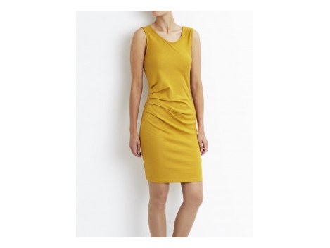 Delikatna sukienka z wodą na dekolcie. Na lewym ramieniu ozdobne zaszewki. Sukienka wiązana w talii. Skład: 95% wiskoza, 5% elastan.
