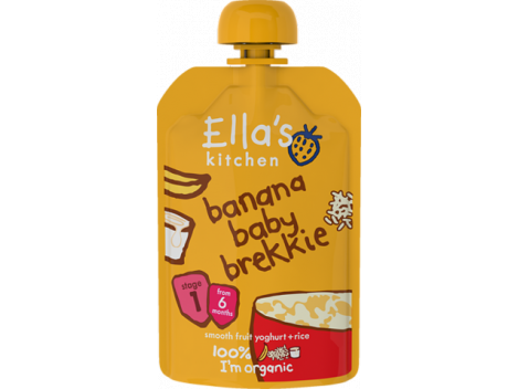 EKOLOGIŠKA Ella's Kitchen BANANŲ tyrelė su NATŪRALIU JOGURTU ir RUDAISIAIS RYŽIAIS kūdikiams nuo 6 mėn., 100g.