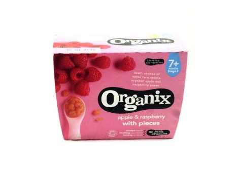 EKOLOGIŠKA obuolių gabaliukų ir aviečių tyrelė, kūdikiams nuo 7 mėn., Organix, 4x95 g