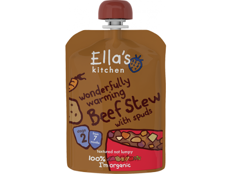 "ELLA'S KITCHEN" ekologiška jautienos troškinys su bulvėmis kūdikiams nuo 7 mėn, neto masė 130g.Ekologiška ir gardi kūdikių vakarienė!  Skirta ne mažesniems kaip 4 mėn. amžiaus kūdikiams. Visus produktus skirtus jaunesniems kaip 6 mėn. kūdikiams galima vartoti tik gydytojui pediatrui rekomendavus.100g produkto energinė ir maistinė vertė: 292 kJ / 69 kcal, baltymų – 4,5 g, angliavandenių – 10,7 g, iš kurių cukrų – 0,1 g, riebalų – 0,5 g, iš kurių sočiųjų riebalų rūgščių – 0,1 g, ląstelienos – 2,0 g, natrio pėdsakai.Paruošimas: Išspausti troškinį į dubenėlį ar tiesiai į šaukštelį. Jei norite šilto troškinio, įdėkite troškinį su pakuote į karštą vandenį. Būkite atsargūs, nes maistas gali būti per karštas ir nudeginti. Patikrinti maisto temperatūrą prieš maitinant.Su pakuote negalima dėti į mikrobangų krosnelę. Mažas kamštelis netinka vaikams iki 3 metų.Laikyti sausoje ir vėsioje vietoje. Atidarius pakuotę, laikyti šaldytuve ir suvartoti per 24 valandas. Sudėtis: ekologiškas daržovių sultinys, 35 % (vanduo ir ekologiškos daržovės: morkos, pastarnokai, porai, svogūnai, griežčiai, pipirai, mairūnai, petražolės ir čiobreliai), ekologiškos morkos (22 %), ekologiškos bulvės (22 %), ekologiška jautiena (11 %), ekologiški pomidorai (6 %), ekologiški pastarnokai (4 %), ekologiškas žolelių mišinys (<1 %), kas nors dar 0%.