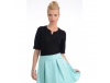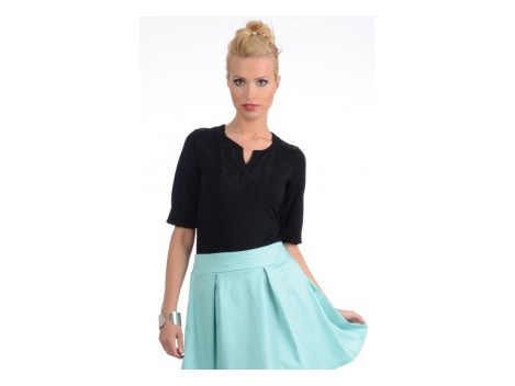 Žavingas moteriškas marškinėliai stiprios spalvos ir su dekoratyviniu mazgas pažvelgti į kairę. Giliai V-iškirpte ir trumpomis rankovėmis. Didžiosios duetas - v...