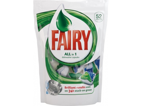 FAIRY All in Green daugiafunkcinės indaplovių kapsulės, 52 vnt. Automatinių indaplovių kapsulės. Įdėkite kapsulę į skirstytuvą ir uždarykite. Neišvyniokite ir nepažeiskite kapsulės. Kapsulę lieskite tik sausomis rankomis. Norėdami pasiekti geriasių rezultatų, naudokite skirstytuve, jeigu kapsulė netelpa, uždėkite ją ant įrankių krepšelio viršaus ir pasirinkite programą be išankstinio plovimo. Jūsų indaplovė tūrėtų plauti veiksmingai net jei užsidega skalavimo priemonės ar druskos signalinė lemputė. Įsitikinkite, kad sidabras nesiliečia su nerūdijančiu plienu. Neplaukite trapaus porceliano ar plono krištolo.Saugoti nuo vaikų. Patekus į akis ar prarijus, nedelsiant kreipkitės į gydytoją.