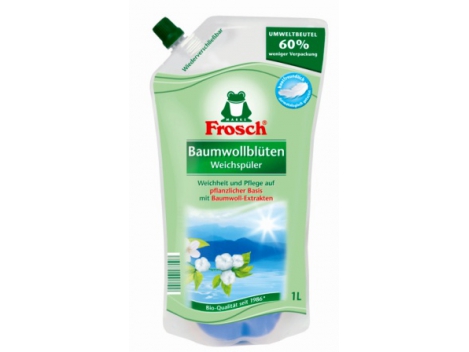 "FROSCH" medvilnės žiedų kvapo koncentruotas audinių minkštiklis, 1 l Ypatingas minkštumas ir aromatas! Naudojama spalvotiems ir baltiems skalbiniams, kad jie maloniai kvepėtų, taptų minkšti. Tinka skalauti medvilnei, vilnai, viskozei, melanžiniams audiniams ir sintetiniam pluoštui (pvz. elastanui). Sudėtyje yra augalinės kilmės aktyviųjų medžiagų, todėl audinio pluoštas natūraliai prižiūrimas ir išsaugomas skalbinių pralaidumas orui. Kadangi jame naudojami geriausios kokybės kvapai, sumažėja odos dirginimo pavojus. Sudėtyje nėra fosfatų, formaldehido. Dermatologiniai tyrimai patvirtino, kad odą labai gerai toleruoja šią priemonę.
