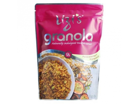 Granola – tobulų pusryčių receptas! Skrudinti dribsniai su belgišku šokoladu, mangais, pistacijomis sprogsta maistingosiomis medžiagomis, energija ir tobulai dera su jogurtu – pusryčiams, o užbarstyta ant ledų ar šviežių vaisių – desertui. Pagaminta Didžiojoje Britanijoje pagal ponios Lizi receptą – nuo Assorti.lt lentynų Jums! Granola su pasifloromis ir pistacijomis LIZI's, 400g  Ši tropinio skonio granola yra iškepta turtingoje pasiflorų tyrėje bei pagardinta kokosų ir pistacijų riešutų gabalėliais, saulėgrąžomis, moliūgų sėklomis ir linų sėmenimis. Ši granola jums suteiks ilgalaikės energijos bei aprūpins jūsų organizmą naudingomis omega-3 rūgštimis, esančiomis sėklose bei riešutuose. Skanaukite su pienu ar jogurtu. Galite užberti ant savo mėgiamiausio deserto, ledų ar tiesiog ant šviežių vaisių.  Sudėtis: Jumbo avižos, rapsų aliejus, džiovintas kokosas, fruktozė, oligofruktozė*, obuolių sultys iš koncentrato, juodoji melasa, pistacijų puselės (3%), anakardžių riešutai, smulkinti migdolai, smulkinti lazdyno riešutai, pasiflorų tyrė (1%), moliūgų sėklos, auksaspalviai linų sėmenys, saulėgrąžų sėklos, natūralus aromatas. * - oligofruktozė yra natūralios maistinės skaidulos, gautos iš cikorijos; jos veikia prebiotiškai (simbiotškai) bei padeda palaikyti sveiką virškinamąjį traktą.