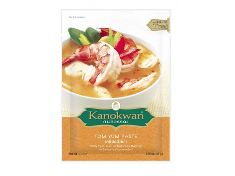 Greitai paruošiama TAILANDIETIŠKA SRIUBA Tom Yum, Kanokwan, 30 g Tom Yum (tariama "tom jum") - tradicinė skaidri ir aštri tailandietiška sriuba. Aštri ir kvapni, greitai paruošiama sriuba suteiks energijos ir padės plačiai atmerkti akis :) Mažai riebalų! Paruošimas: užvirkite 2 puodelius vandens ir į jį sudėkite Tom Yum pastą iš pakuotės. Pagal skonį įdėkite krevečių, vištienos gabalėlių, grybų. Virkite, kol krevetės ar vištiena galutinai išvirs. Paskaninkite mėgstamais prieskoniais. Jei būtumėte Tailande, sriubą šefas būtinai pagardintų kalendra. Sudėtis: cukrus 25%, druska 21%, prieskoniai 20%, aliejus 16%, citrinžolė 13%, rūgštingumą reguliuojanti medžiaga: citrinos rūgštis 5%.