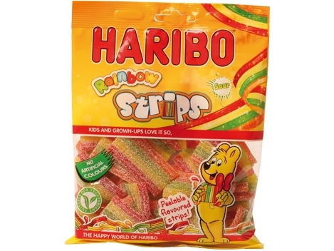Gumminukai Haribo Rainbow Sour Strips, 150g Sudėtis: gliukozės-fruktozės sirupas, cukrus, kukurūzų krakmolas, drėkiklis (sorbitolio sirupas), kvietiniai miltai, vanduo, emulsiklis (E471),rūgštikliai (citrinų rūgštis, obiolių rūgštis), rūgštingumą reguliuojančios medžiagos ( kalcio citratas, natrio malatas), kvapiosios medžiagos, vaisių ir augalų koncentratai (juodieji srbentai, šeivamedžio uogos, aronija, vynuogės), šeivamedžio uogų ekstraktai, dažikliai (kurkuminas, chlorofilų vario kompleksai), glazūravimo medžiagos (vaškas, karnaubo vaškas).