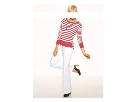 Starke Farbe - klassisch kombistarkes Design. Tolle Lochmusterdetails vorn. Rundhalsausschnitt, überschnittene Schultern. Breite Rippenbündchen an den Säumen. F...