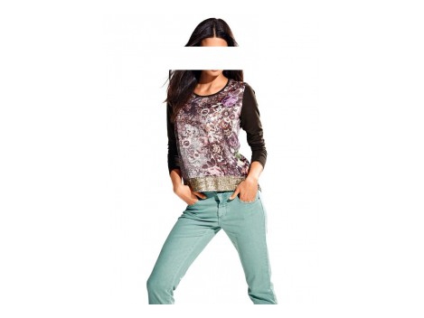 Įspūdingos žaidimas su kontrastų. Permatomas ryškus marškinėliai madinga medžiagų su gėlių spausdinti. Galinis uni juoda apranga, prieš kilnus spausdinta satino...