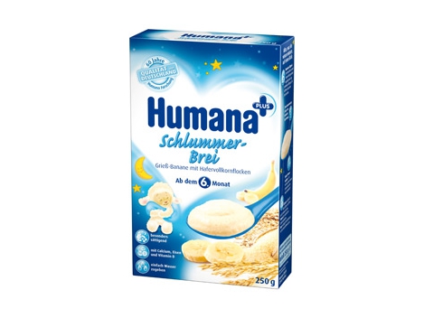 "HUMANA Good Night" pieniška bananų košė kūdikiams nuo 6 mėn, neto masė 250gSu meile Jūsų mažyliui! Sudėtyje yra gliuteno. Ypač soti. Turinti kalcio, būtino stipriems kaulams. Paprastai paruošiama. Ypač soti: turinti labai vertingų nesmulkintų grūdų, kurie užtikrina ilgalaikį sotumo pojūtį. Tai padeda Jūsų kūdikiui gerai išsimiegoti. Sudėtyje nėra konservantų ir dažiklių (pagal įstatymą). Lengvai paruošiama; pasitelkus Humana vandenį, nebūtina virti! Kalcis: svarbus stipriems kaulams ir sveikiems dantukams. Vitaminas D: padeda įsisavinti mikroelementus. Geležis: svarbi kraujotakos sitemai. Per dieną patariame suvalgyti mažiausiai vieną košės porciją. Humana Miego košė, dėl turtingos nesmulkintų grūdų sudėties, puikiai tinka valgyti vakare. Jūsų vaikelis auga ir akivaizdžiai vystosi. Kiekvieną dieną kūdikiui būtinas šviežias oras ir daug judėjimo. Norint, kad vaikelis augtų sveikas, jam būtinas ir sveikas ir įvairus maistas. Tam, kad Jūs su vaikeliu galėtumėte visiškai pasinerti į kūdikio pasaulio tyrinėjimą, mes pasirūpinsime sveiku kūdikio maistu. Humana košės yra skanios ir didiesiems – puikiai tinka kaip užkandis tarp valgymų.Paruošimas: 1.Kiekvienam valgymui skirtą geriamojo vandens kiekį užvirkite ir ataušinkite iki 50˚C arba taip pat panaudokite Humana Baby-Wasser, sušildydami jį iki 50˚C. 2.Į indą įberkite košės miltelių. 3.Pripilkite reikiamą vandens arba Humana Baby-Wasser kiekį. 4.Maišykite, kol pasidarys norima masė. Vartojimo kiekio: Nuo 6.mėn. 200g paruoštos košės: 50g košės miltelių (5½ valgomojo šaukšto), 150ml vandens. Nuo 8.mėn. 220g paruoštos košės: 55g košės miltelių (6 valgomojo šaukšto), 165ml vandens.Svarbūs nurodymai: Jei vaiko maitinimas buteliuku užsitęsė ir vaikas nevalgo šaukštu, nereikia leisti ilgai „kramtyti“ buteliuko. Per dažnas arba ilgalaikis dantų sąlytis su angliavandenių turinčiomis maistinėmis medžiagomis gali sukelti dantų gedimus – kariesą ir turėti kitų kenksmingų pasekmių. Prašome rūpintis savo vaiko dantų sveikata jau nuo pirmojo dantuko. Kiekvienam valgymui paruoškite šviežią valgį. Valgio likučiai vėliau valgyti netinka. Pakuotė skirta apytiksliai 5 porcijoms.Sudėtis: nugriebtas pienas, augalinės kilmės aliejai, 10,5% bananų dribsniai, maltodekstrinas, 10% nesmulkintų avižų dribsniai, krakmolas, vaisių cukrus, 6,5% kukurūzų, manų, ryžių dribsniai, vynuogių cukrus, kalcio karbonatas, L-tirozinas, vitaminų mišinys (C, niacinas, E, pantoteno rūgštis, B6, B1, A, B2, folio rūgštis, K1, biotinas, D3, B12), geležies difosfatas, vanilinas, L-triptofanas, kalio jodatas.