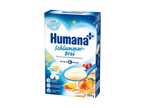 "HUMANA Good Night" pieniška persikų košė kūdikiams nuo 6 mėn, neto masė 250gSu meile Jūsų mažyliui! Pieniška Miego (Persikų-nesmulkintų avižinių dribsnių) košė. Nuo 6 mėnesių. Sudėtyje yra gliuteno. Ypač soti. Turinti kalcio, būtino stipriems kaulams. Paprastai paruošiama. Ypač soti: turinti labai vertingų nesmulkintų grūdų, kurie užtikrina ilgalaikį sotumo pojūtį. Tai padeda Jūsų kūdikiui gerai išsimiegoti. Sudėtyje nėra konservantų ir dažiklių (pagal įstatymą). Lengvai paruošiama; pasitelkus Humana vandenį, nebūtina virti! Kalcis: svarbus stipriems kaulams ir sveikiems dantukams. Vitaminas D: padeda įsisavinti mikroelementus. Geležis: svarbi kraujotakos sistemai. Per dieną patariame suvalgyti mažiausiai vieną košės porciją. Humana Miego košė, dėl turtingos nesmulkintų grūdų sudėties, puikiai tinka valgyti vakare. Jūsų vaikelis auga ir akivaizdžiai vystosi. Kiekvieną dieną kūdikiui būtinas šviežias oras ir daug judėjimo. Norint, kad vaikelis augtų sveikas, jam būtinas ir sveikas ir įvairus maistas. Tam, kad Jūs su vaikeliu galėtumėte visiškai pasinerti į kūdikio pasaulio tyrinėjimą, mes pasirūpinsime sveiku kūdikio maistu. Humana košės yra skanios ir didiesiems – puikiai tinka kaip užkanda tarp valgymų.Paruošimas: 1.Kiekvienam valgymui skirtą geriamojo vandens kiekį užvirkite ir ataušinkite iki 50˚C arba taip pat panaudokite Humana Baby-Wasser, sušildydami jį iki 50˚C. 2.Į indą įberkite košės miltelių. 3.Pripilkite reikiamą vandens arba Humana Baby-Wasser kiekį. 4.Maišykite, kol pasidarys norima masė. Vartojimo kiekio: Nuo 6.mėn. 200g paruoštos košės: 50g košės miltelių (5½ valgomojo šaukšto), 150ml vandens. Nuo 8.mėn. 220g paruoštos košės: 55g košės miltelių (6 valgomojo šaukšto), 165ml vandens. Svarbūs nurodymai: Jei vaiko maitinimas buteliuku užsitęsė ir vaikas nevalgo šaukštu, nereikia leisti ilgai „kramtyti“ buteliuko. Per daug dažnas arba ilgalaikis dantų sąlytis su angliavandenių turinčiomis maistinėmis medžiagomis gali sukelti dantų gedimus – kariesą ir turėti kitų kenksmingų pasekmių. Prašome rūpintis savo vaiko dantų sveikata jau nuo pirmojo dantuko. Kiekvienam valgymui paruoškite šviežią valgį. Valgio likučius vėliau valgyti netinka. Pakuotė skirta apytiksliai 5 porcijoms.Sudėtis: nugriebtas pienas, 20,7% nesmulkinti avižiniai dribsniai, augalinės kilmės aliejai, krakmolas, maltodekstrinas, vaisių cukrus, vynuogių cukrus, gliukozės sirupas, 0,8% persikų milteliai, kalcio karbonatas, natūrali kvapioji medžiaga, L-tirozinas, vitaminų mišinys (C, niacinas, E, pantoteno rūgštis, B6, B1, A, B2, folio rūgštis, K1, biotinas, D3, B12), geležies difosfatas, vanilinas, L-triptofanas, kalio jodatas.