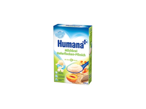 "HUMANA" pieniška avižinė košė su persikais kūdikiams nuo 6 mėn, neto masė 250gSu meile Jūsų mažyliui! Gardi ir subalansuota. Turi kalcio, būtino stipriems kaulams. Paprastai paruošiama. Skirta kūdikio poreikiams tenkinti. Neturi konservantų ir dažiklių. Lengvai paruošiama – pasitelkus Humana vandenį daugiau nebereikia virti! Kalcis: svarbus stipriems kaulams ir sveikiems dantukams. Vitaminas D: padeda įsisavinti mikroelementus. Geležis: svarbi kraujotakos sistemai. Jūsų vaikelis auga ir akivaizdžiai vystosi. Kiekvieną dieną kūdikiui būtinas šviežias oras ir daug judėjimo. Norint, kad vaikelis augtų sveikas, jam būtinas ir sveikas ir įvairus maistas. Tam, kad Jūs su vaikeliu galėtumėte visiškai pasinerti į kūdikio pasaulio tyrinėjimą, mes pasirūpinsime sveiku kūdikio maistu. Per dieną patariame mažiausiai vieną košės porciją. Humana košės yra skanios ir didiesiems – puikiai tinka kaip užkandis tarp valgymų.Paruošimas. 1.Kiekvienam valgymui skirtą geriamojo vandens kiekį užvirkite ir ataušinkite iki 50˚C arba panaudokite Humana Baby-Wasser, pašildydami jį iki 50˚C. 2.Į indą įberkite košės miltelių. 3.Pripilkite reikiamą vandens arba Humana Baby-Wasser kiekį. 4.Maišykite, kol pasidarys norima masė. Vartojimo kiekio: Nuo 6.mėn. 200g paruoštos košės: 50g košės miltelių (5½ valgomojo šaukšto), 150ml vandens. Nuo 8.mėn. 220g paruoštos košės: 55g košės miltelių (6 valgomojo šaukšto), 165ml vandens.Svarbūs nurodymai: Jei vaiko maitinimas buteliuku užsitęsė ir vaikas nevalgo šaukštu, nereikia leisti ilgai „kramtyti“ buteliuko. Per daug dažnas arba ilgalaikis dantų sąlytis su angliavandenių turinčiomis maistinėmis medžiagomis gali sukelti dantų gedimus – kariesą ir turėti kitų kenksmingų pasekmių. Prašome rūpintis savo vaiko dantų sveikata jau nuo pirmojo dantuko. Kiekvienam valgymui paruoškite šviežią valgį. Valgio likučiai vėliau valgyti netinkami. Pakuotė skirta apytiksliai 5 porcijoms.Sudėtis: nugriebtas pienas, 20,7% avižiniai dribsniai, augalinis aliejus, krakmolas, maltodekstrinas, vaisių cukrus, vynuogių cukrus, gliukozės sirupas, 0,8% persikų milteliai, kalcio karbonatas, natūrali kvapioji medžiaga, L-tirozinas, vitaminų mišinys (C, E, niacinas, pantoteno rūgštis, folio rūgštis, biotinas, A, B6, B1, K, B2, D3, B12), geležies difosfatas, vanilinas, L-triptofano, kalio jodatas.