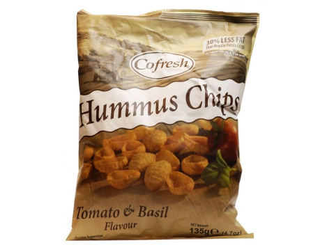 HUMUSO traškučiai su POMIDORAIS IR BAZILIKU, Cofresh, 135 g  Naujiena Lietuvoje - humuso traškučiai!Humuso (avinžirnių) traškučiuose yra net 30% mažiau riebalų nei įprastuose bulvių traškučiuose!Mėgaukitės natūraliai sveikesniais pomidorų ir baziliko skonio avinžirnių traškučiais:- tinka veganams ir vegetarams,- be GMO,- visi ingredientai - natūraliai be gliuteno,- jokių dirbtinių dažiklių ir konservantų.   Sudėtis: avinžirnių miltai, ryžiai, bulvių krakmolas, augalinis (rapsų) aliejus, kukurūzų miltai, pomidorų ir baziliko skonius suteikia ryžių miltai, dekstrozė, cukrus, druska, pomidorų milteliai, mielių ekstrakto milteliai, svogūnų milteliai, prieskoninės žolelės, česnako milteliai, citrinos rūgštis, prieskoniai, natūralus dažiklis: paprikos milteliai.