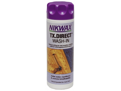 Impregnantas kvėpuojantiems rūbams Nikwax TX.Direct Wash-In 300ml Vandens pagrindu pagaminta impregnavimo priemonė. Atnaujina ir pagerina drabužių su „kvėpuojančiomis“ membranomis vandens atstūmimo savybes. Rekomenduojama drabužiams su Gore-Tex, SympaTex, eVENT, Permatex, ir Nikwax Analogy membranomis. Geriausiam rezultatui pasiekti nuimkite visas neskalbiamas dalis ir visada iš pradžių išskalbkite su Nikwax TechWash. Prieš impregnavimą skalbinių nereikia džiovinti. Gerai suplakite prieš naudojimą. Laikykitės priežiūros etiketėje pateiktų nurodymų. Skalbimas skalbyklėje: - Iš skalbimo priemonių skyriaus pašalinkite visus skalbimo priemonių likučius. - Impregnuokite ne daugiau dviejų švarių drabužių vienu metu. - Įpilkite po du pilnus dangtelius (100ml) kiekvienam drabužiui. -Pasirinkite sintetinių drabužių skalbimo 30C temperatūroje ir lėto gręžimo programą. Neskalbkite skalbykloje drabužių su atsiklijavusiomis siūlių sandarinimo juostelėmis*. Skalbimas rankomis (mūvėkite pirštines): - Pamerkite vieną švarų drabužį į 6litrus šilto vandens. - Įpilkite vieną pilną dangtelį (50ml) TX.Direct Wash-IN. -Išmaišykite, palikite 5-10 minučių mirkti ir vėl gerai išmaišykite. -Kruopščiai išskalaukite šaltame vandenyje. Džiovinimas: Džiovinkite natūraliai arba žemoje temperatūroje džiovykleje jeigu tai numatyta priežiūros etiketėje. *Blogai užklijuotos juostelės kartais atsiklijuoja. Jas galima priklijuoti atitinkamais klijais drabužiui išdžiuvus po impregnavimo. Impregnuotus drabužius skalbkite tik su Nikwax TechWash. Nenaudokite įprastinių skalbimo priemonių.