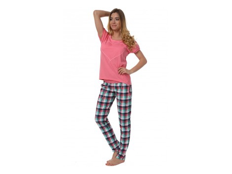 Madingi pižamos iš skanus rožinės persikų spalvos. Jį sudaro marškinėliai trumpomis rankovėmis ir 3/4 ilgio kelnėmis. Marškinėliai turi teigiamą žinią "Enjoy sm...