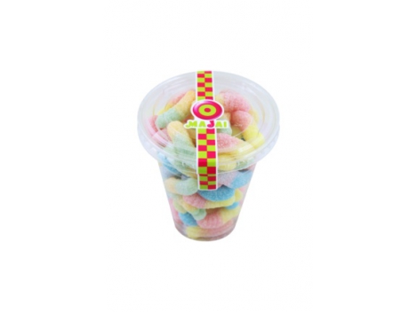 RŪGŠČIOS OBUOLIŲ SKONIO JUOSTELĖS, 150g Sudedamosios dalys: gliukozės sirupas, cukrus, želatina, rūgštingumą reguliuojančios medžiagos (E330, E296), dažiklis E1...