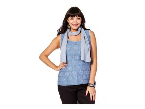 Ein elegantes Duo, das vielfältig kombiniert und variiert werden kann. Bezauberndes Top mit raffiniertem Spitzenbesatz im Vorderteil - doppellagig gearbeitet, obere Lage Spitze, darunter mit blickdichtem Jersey. Tiefer Rundhalsausschnitt, BH freundliche, breite Träger. Der dazu passende Schal verleiht diesem Ensemble eine besonders extravagante Note. Größenangepasste Länge von ca. 66 bis 76 cm, in steigenden Größen figurgünstig verlängert. Jerseyschal ca. 155 cm x 25 cm. Trageangenehme Qualität aus 95% Baumwolle/5% Elasthan. Spitze aus 100% Polyester.