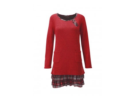 Stilgerecht entspannen mit tollem Lagen-Look. Das Oberteil mit Pointelle-Muster und der gewebte Rockteil mit schwingenden Volants sehen einfach großartig aus. Vielseitig tragbar. Rundhalsausschnitt, Besatz mit Zierknöpfen. Länge ca. 90 cm. Volantabschluß am Futtersaum. Weicher Strick aus 100% Polyacryl. Besatz und Volants aus 100% Baumwolle. Futter aus 100% Polyester.