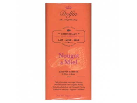 JUODASIS ŠOKOLADAS SU NUGA IR MEDUMI Dolfin, 70g Dolfin šokoladų didieji meistrai dalijasi sodriu, tikro šokolado skoniu. Iš tolimų kelionių parsivežti autentiški ir įdomūs deriniai, kartais gali stebinti, tačiau visuomet išlieka harmoningi. Vaisiai, prieskoniai, žolelės ir gėlės yra maišomi su tauriuoju šokoladu, taip surandant originalius receptus. Naujovės ir kūrybiškumas – štai už ką Dolfinšokoladai atrado vietą gurmanų širdyse.Sudedamosios dalys: cukrus, kakavos masė, kakavos sviestas, nenugriebto pieno milteliai, nuga 4% (cukrus, migdolai, , gliukozės sirupas, medus, kiaušinių baltymai, vanilė), emulsiklis: sojos lecitinas, natūrali medaus kvapioji medžiaga, natūrali vanilės kvapioji medžiaga.Sudėtyje yra: migdolų, kiaušinių. Maistinė vertė 100g: energinė vertė 546kcal, riebalų 33g, iš kurių riebalų rūgščių 20g, anglavandenių 53g, iš kurių cukraus 51g, baltymų 7g, natrio 63mg, skaidulų 3g.