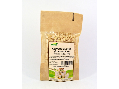 Kedro riešutų branduoliai, 40gParagaukite kedro riešutėlių!  Pasigardžiuokite nepakartojamu, nepamirštamu kedro riešutų skoniu. Riešutai ne tik skanūs, bet ir nepaprastai maistingi.Kedro riešutai yra patys švelniausi, nes juose nėra ląstelienos, jie lengvai virškinami. Kedro riešutuose yra baltymų, kuriuos lengvai ir greitai įsisavina žmogaus organizmas (paimta iš http://www.15min.lt). Dar daugiau apie riešutus galite paskaityti šiame straipsnyje >>Sudėtis: kedro riešutų branduoliai