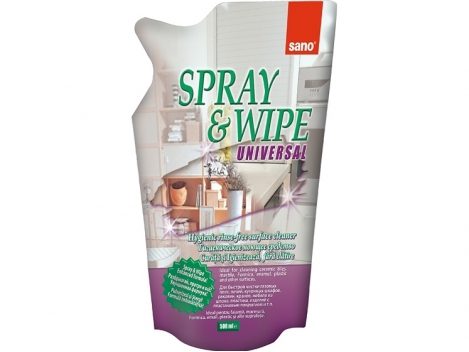 Koncentruotas UNIVERSALAUS paviršių valiklio Sano Spray & Wipe papildymas, 500 ml Šis universalus valiklis valo nešvarumus ir pašalina riebalus nuo bet kurių paviršių - iš karto be plovimo!Turi dezinfekuojančių savybių.Skirta greitam:- Dujinių viryklių ir krosnelių;- Virtuvinių spintelių;- Kriauklių ir kranų;- Stalų;- Durų ir sienų su plastikine danga;- Baldų ir plastiko plokščių, plastikinių žaliuzių t. t. valymui.Naudojimas: priemonę užpurkšti ir patrinti – ir to pakanka. Prieš naudojimą patikrinti mažiau matomoje vietoje. Užpurkšti ir iškart patrinti šluoste ar popieriumi, nebūtina praplauti, po naudojimo uždaryti saugiklį.