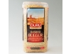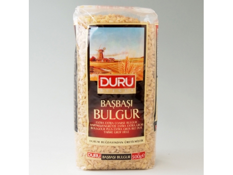 Kruopos Bulgur stambios, Duru,500g Bulgur yra iš kviečių grūdų pagamintos kruopos, labai populiarios Šiaurės Afrikoje, Artimuosiuose Rytuose ir Vidurio Azijoje. Kruopos ruošiamos verdant kviečių grūdus vandenyje ir vėliau juos džiovinant. Tokiu būdu kviečio grūdo vidus tampa stiklo kietumo! Po to kviečiai sudrėkinami, kad suminkštėtų sėlenys - išorinis grūdo sluoksnis. Grūdai tuomet malami taip, kad atsiskirtų sėlenys ir grūdo gemalas, o grūdo endosperma subyrėtų į stambokas kruopas. Gautas rezultatas yra maistinga kviečių forma, kuri gali būti saugoma labai ilgai, o išverda palyginus labai greitai - bulgur.Stambios bulgur kruopos yra naudojamos kaip ryžiai ar kuskusas: virtos vandenyje ar garuose tinka bet kokiam skystam patiekalui, plovams, troškiniams ar salotoms, kepinių įdarams, o smulkios bulgur kruopos tinka ruošti vegetariniams maltinukams, kotletams, košėms ar saldiems pudingams. Paruoštos bulgur kruopos yra riešutų skonio, ilgiau kramtomos, pagal maistingumą turtingesnės už ryžius ar kuskusą, turi daugiau maistinių skaidulų, baltymų, vitaminų ir mineralų: sudėtyje yra daug kalcio, fosforo, geležies. Paruošimas: 1 dalis bulgur kruopų ir 2 dalys vandens. Užvirinama ir virti apie 15 - 20 minučių. Sudedamosios dalys: kietieji kviečiai.