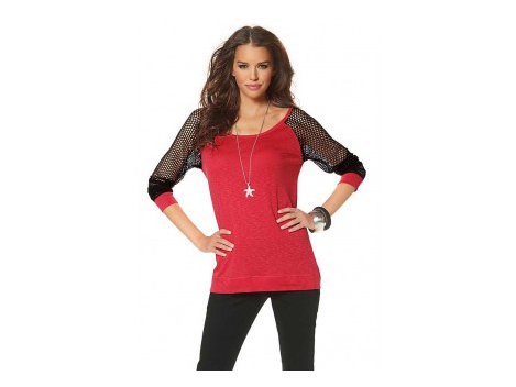 Feuriges Rot und rassiges Schwarz in einer verführerischen Liaison. Stylisches Shirt mit kontrastfarbenen Raglanärmeln aus transparenter Netzware, mit Stoffbündchen am Saum. Großer Rundhalsausschnitt. Länge ca. 67 cm. Weiche Jerseyqualität aus 100% Baumwolle. Netzware aus 98% Baumwolle/2% Elasthan.