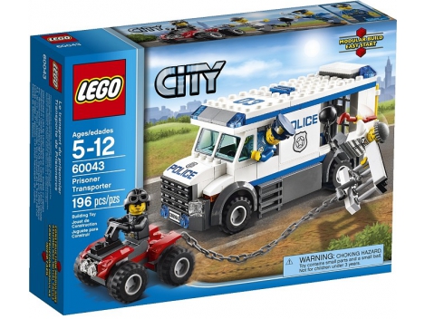 LEGO City Kalinių transporteris, 5-12 metų vaikams (60043) Linksmam žaidimui! Rinkinyje - 196 detalės. O ne! Banditas su savo keturačiu išlaužė policijos furgono grotas ir išlaisvino kalinį padėdamas jam pasprukti. Pasiskubinkit ir pasiviję bėgiką, uždėją jam antrankius pasodinkit atgal į kalėjimą. Rinkinyje yra 1 policininkas ir 2 banditai.Šarvuotas policijos furgonas ir keturatis.Furgonas su didilėmis galinėmis kalėjimo durimis, stoglangiu, dviem salono durim.Keturatis su grandine ir kabliu.Priedai: kamuolys su grandine, racijos, antrankiai, laužtuvas ir raktas.Užkabinkit kablį už furgono grotų ir išlaužkit jas, išlaisvindami kalinį.