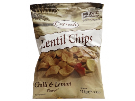 LĘŠIŲ traškučiai SU ČILI PIPIRAIS IR CITRINA, Cofresh, 113 g Naujiena Lietuvoje - lęšių traškučiai! Lęšių traškučiuose yra net 30% mažiau riebalų nei įprastuose bulvių traškučiuose! Mėgaukitės natūraliai sveikesniais čili pipirų ir citrinos skonio lęšių traškučiais:- tinka veganams ir vegetarams,- be GMO,- visi ingredientai - natūraliai be gliuteno,- jokių dirbtinių dažiklių ir konservantų.  Sudėtis: lęšių miltai, bulvių krakmolas, augalinis (rapsų) aliejus, druska, čili ir citrinų skonį suteikia druska, ryžių miltai, prieskoniai, mielių ekstrakto milteliai, česnakų milteliai, svogūnų milteliai, citrinos rūgštis, natūralūs skoniai, citrinos sulčių milteliai, natūralus dažiklis - paprika.