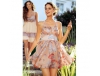 Raffinesse pur - couturiger Schnitt und edle Detailverarbeitung mit stilvollem Design-Statement. Souverän in Szene gesetzte Kreation aus beschwingtem, puderfarbenem Chiffon mit entzückendem Schmetterlings-Druck. Neckholderform, Träger im Nacken zu binden, variabel raffbarer Tunnelzug am Ausschnitt. Blickmagnet sind die aufgesetzten Stoffblüten am Dekolleté und die ausgearbeitete Brustpartie mit Unterbrustnaht und verführerischem, zusätzlichem Dekolletéschlitz, Reizvoller Rückendekolletéschlitz. Breite, eingesetzte Taillenpasse und weit ausschwingender Rockteil. Reißverschluß seitlich. Länge ca. 90 cm. Fgurbetonte Form. Chiffon und Futter aus 100% Polyester.
