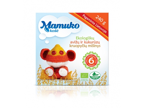 "MAMUKO" ekologiškų avižų ir kukurūzų kruopyčių mišinys košei virti, be pieno, kūdikiams nuo 6mėn, grynasis kiekis 240g Pirmosios ir vienintelės ekologiškos košės gaminamos Lietuvoje ! Be pieno. Be glitimo. Tik natūralūs cukrai.Sudėtis: ekologiškos avižų (41,7%) ir kukurūzų (58,3%) kruopytės.Avižos yra vieni iš didžiausią maistinę vertę turintys grūdiniai produktai, todėl ši košė galėtų būti vienas iš pirmųjų patiekalų, papildantis kūdikio mitybą.Košė yra visiškai natūrali, be maistinių priedų ar konservantų. Išverdama vos per 4-5 minutes.Rūpestingai atrinktos tik aukščiausios kokybės ekologiškos žaliavos iš ekologinių lietuviškų ir ekologinių ES šalių ūkių.Gamintojų internetinė svetainė: www.mamuko.lt